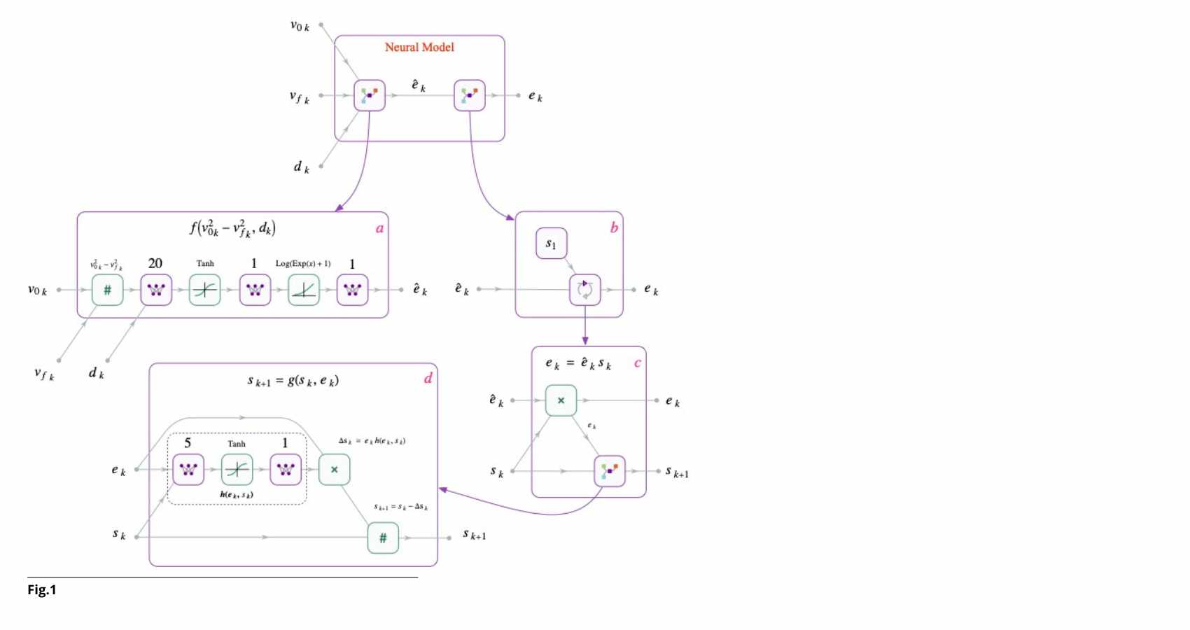 Fig.: Block diagram of the recurrent neural network model, composed of one module (a) that learns the function in (2) and a second module (b) that learns the state dynamics (3). Both modules have physics-informed structures.